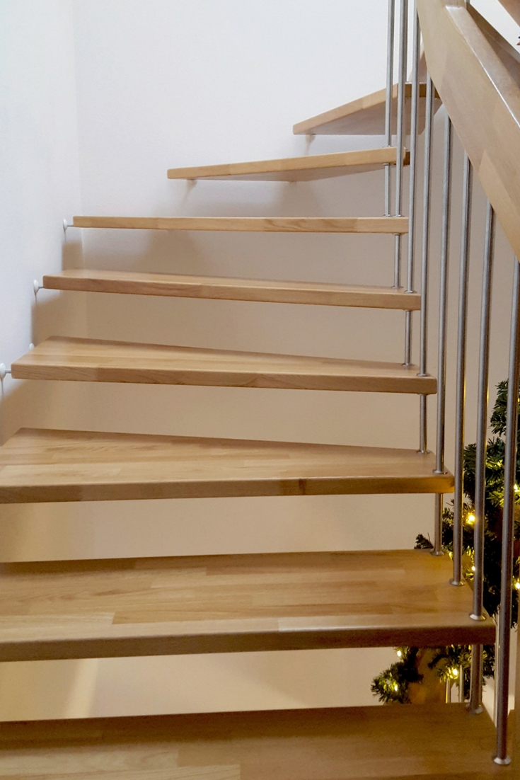 Die Tragbolzentreppe besticht durch ihr modernes Erscheinungsbild und eine hohe Transparenz. Sie ist das Highlight für Ihren Eingangsbereich, lässt durch ihre vielfältigen Wendelungsmöglichkeiten aber auch kleine Räume groß rauskommen.